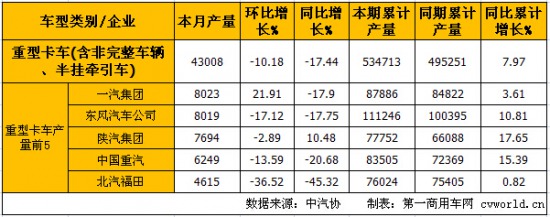 由上表可見(jiàn),環(huán)比上月,銷量前5名的企業(yè)僅有一汽(9.31%)和重汽(3.87%)兩家實(shí)現(xiàn)正增長(zhǎng);與去年同期相比,東風(fēng)汽車公司以22.90%的增幅成為增長(zhǎng)率最高的企業(yè),并以9949輛的銷量保持重卡月度銷量冠軍。