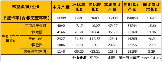 8月份中型卡車(含非完整車輛)產(chǎn)量前5的企業(yè)依次為:東風(fēng)汽車公司(4892輛)、一汽集團(tuán)(4166輛)、重慶力帆(2427輛)、中國(guó)重汽(1886輛)和慶鈴汽車(1148輛),5家合計(jì)生產(chǎn)14519輛,占中型卡車(含非完整車輛)總產(chǎn)量16359輛的88.75%。由上表可見(jiàn),8月產(chǎn)量第2、3、4位的一汽集團(tuán)、重慶力帆和中國(guó)重汽三家企業(yè)實(shí)現(xiàn)環(huán)比、同比雙正增長(zhǎng)。